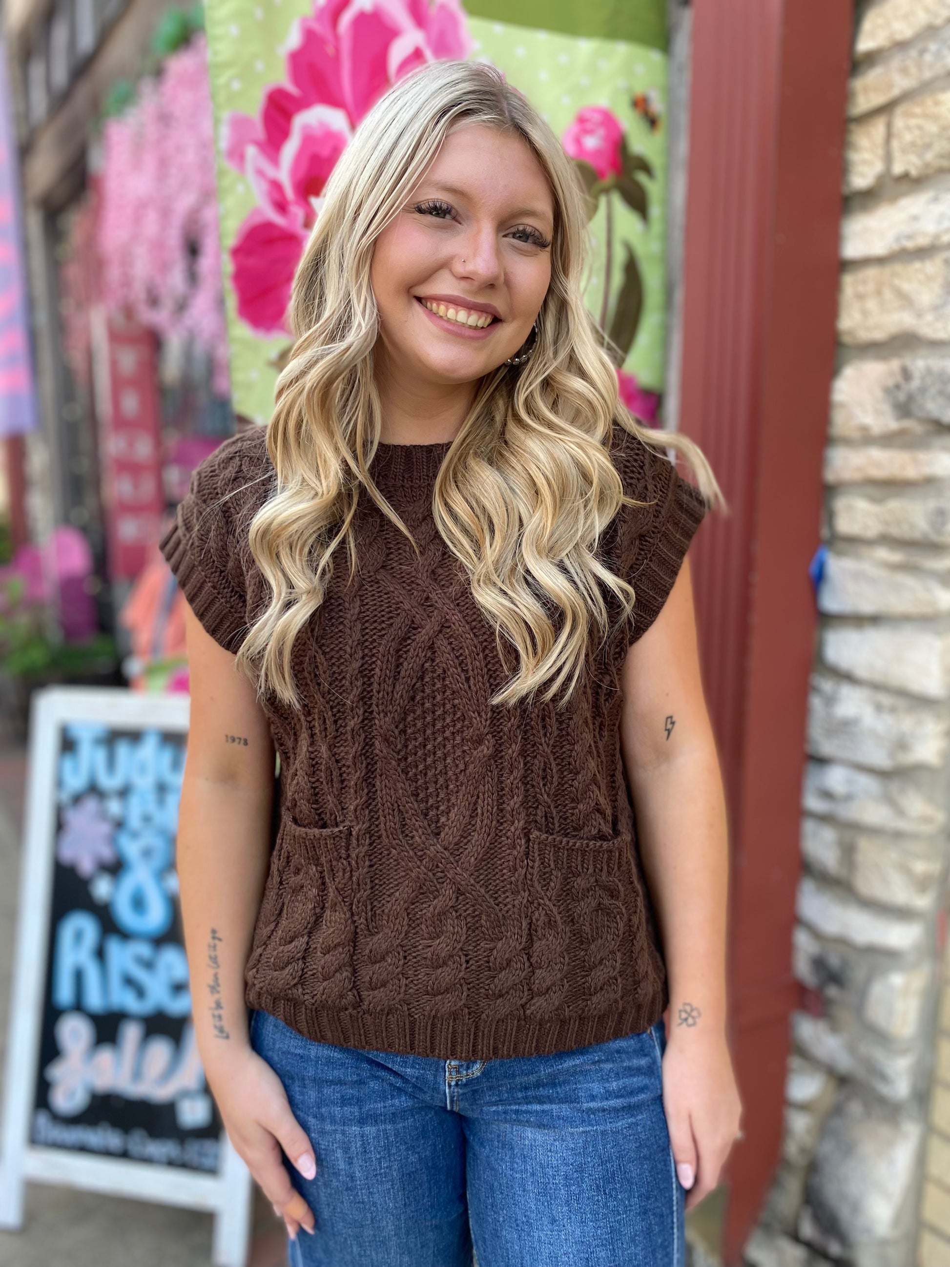 Stay cozy this fall and winter with the Caileigh Cable Knit Sweater in rich chocolate. Featuring convenient front pockets and a soft knit, it’s perfect for layering on chilly days. Comfort and style all in one.