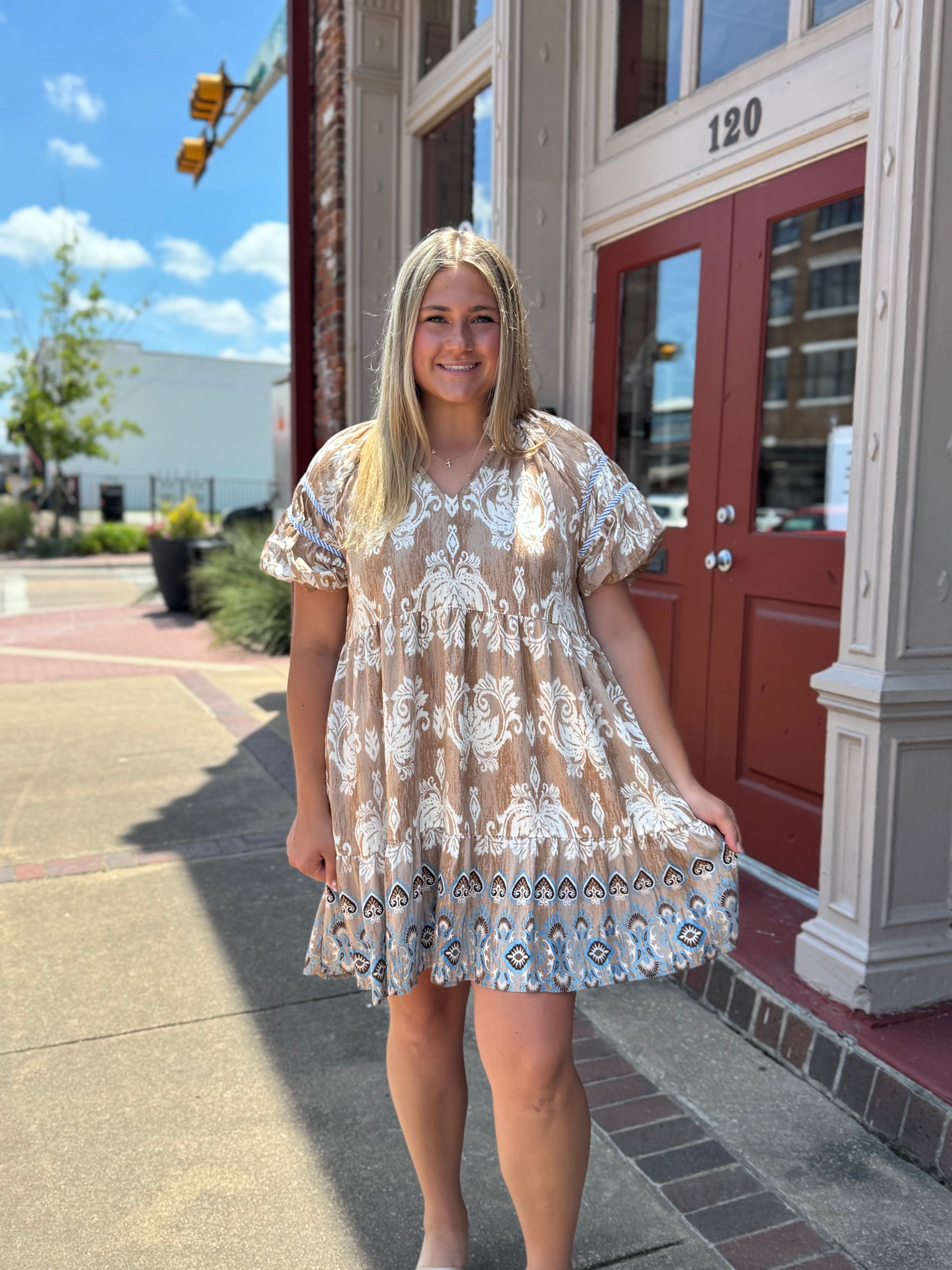The Jena Barn Dance Dress features lovely taupe fabric with charming blue accents, perfect for summer and fall. Its comfortable fit makes it ideal for casual days and lively gatherings alike.