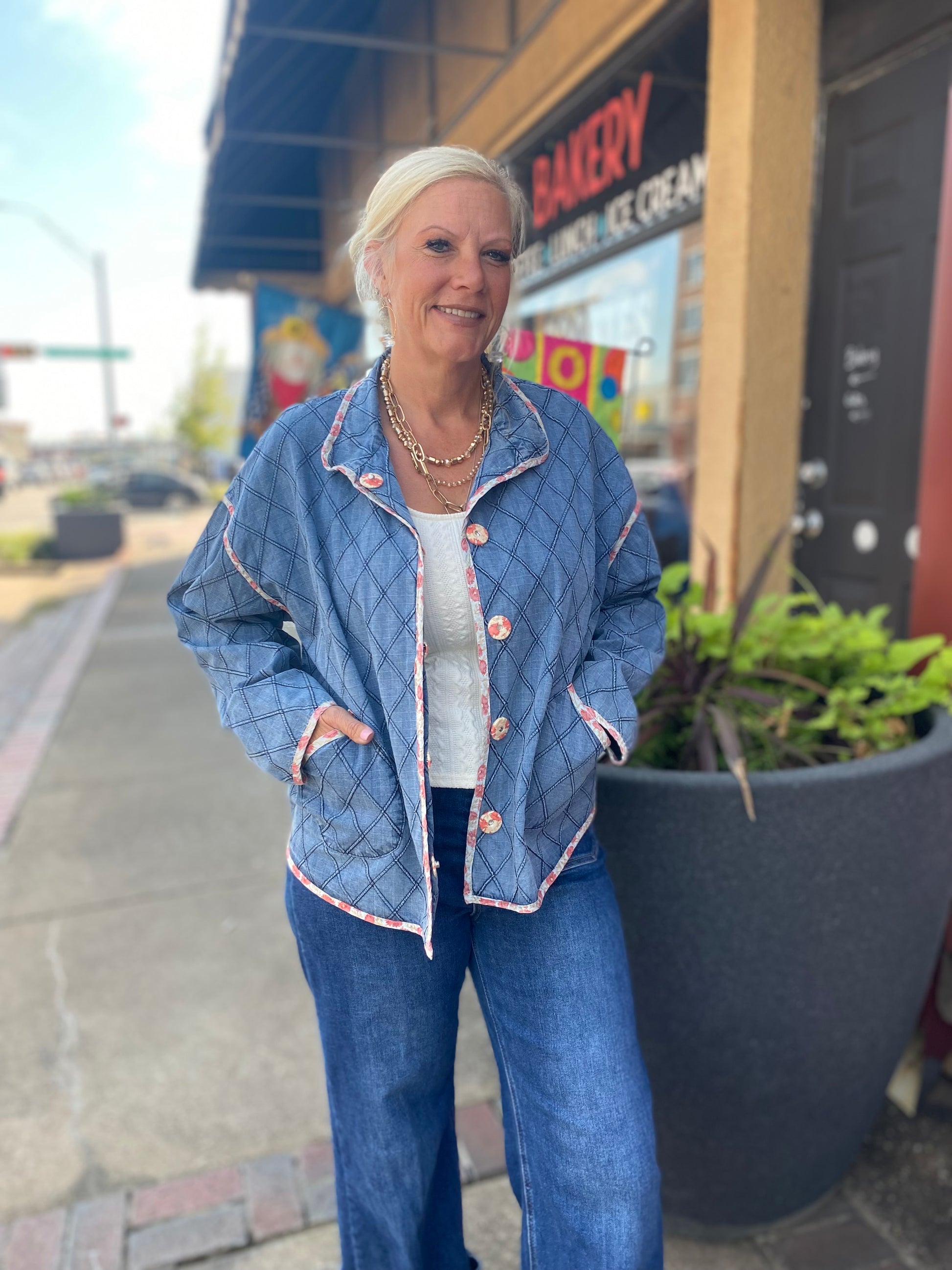 This quilted washed denim jacket offers a trendy look with a relaxed, loose fit. Perfect for layering, it blends style and comfort effortlessly for everyday wear.